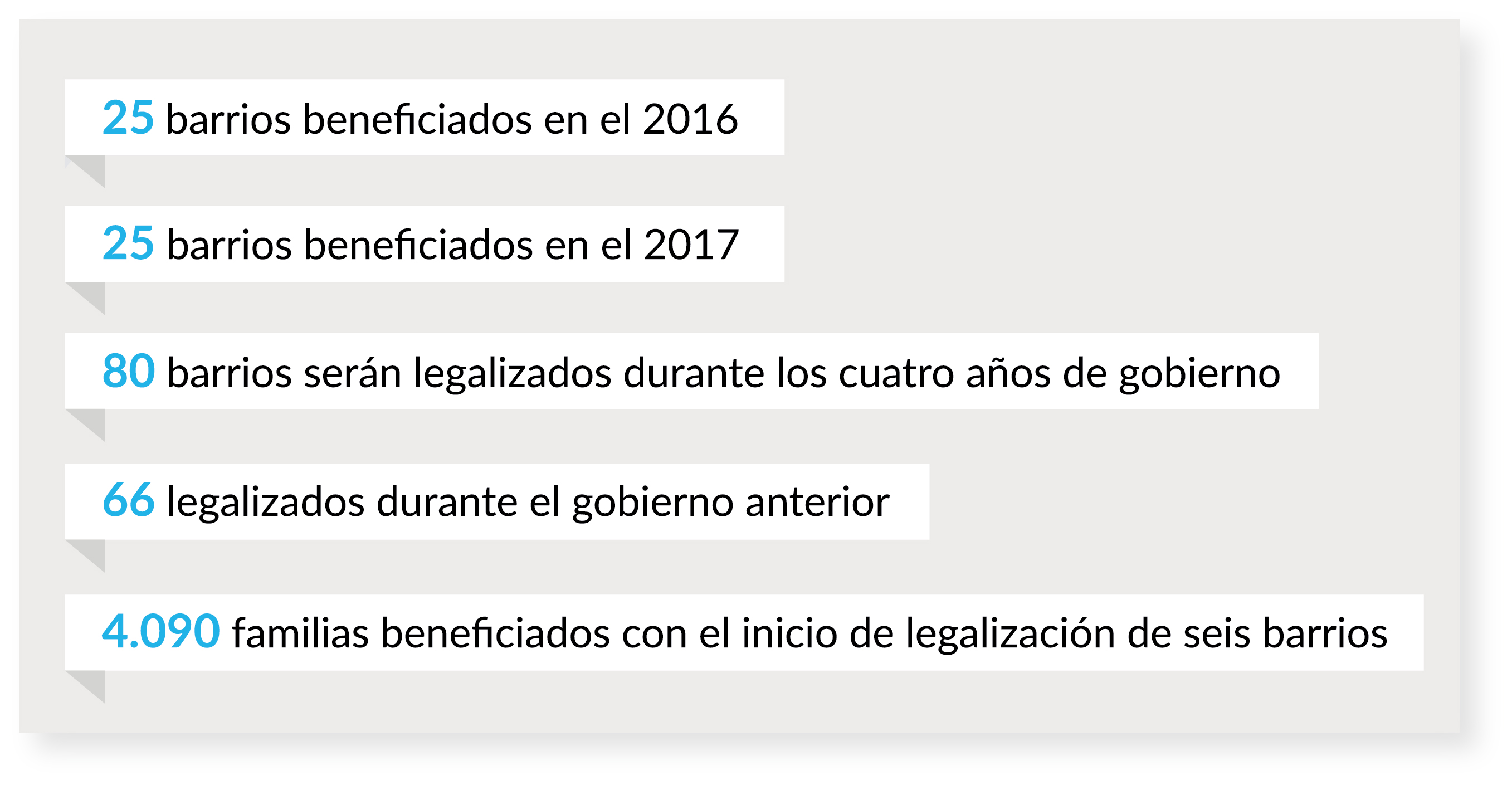 - 4.090 familias beneficiados con el inicio de legalización de seis barrios.
