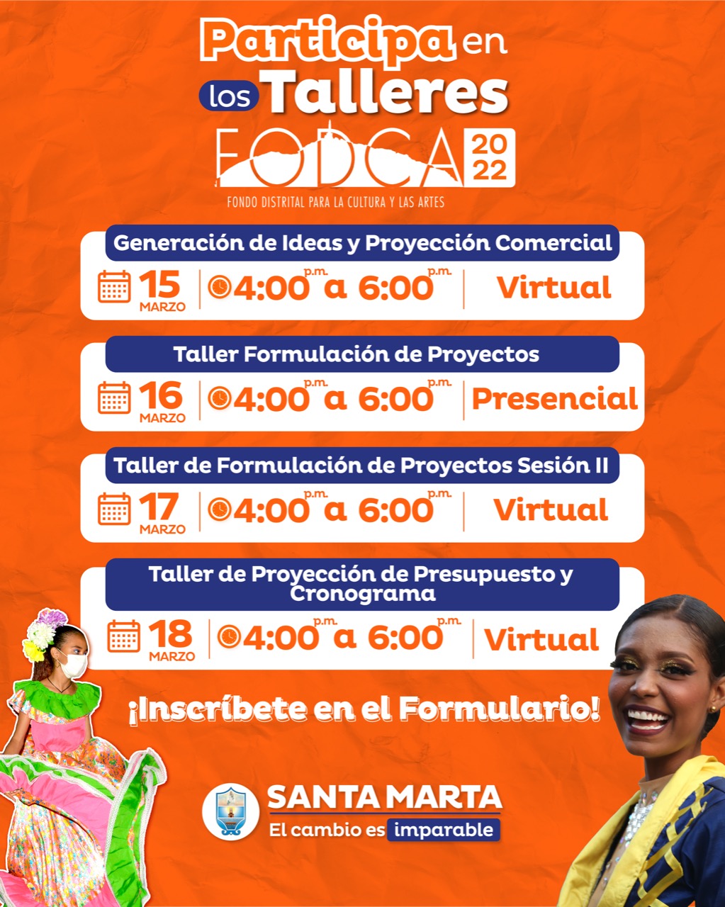 Desde hoy 15 de marzo, la Alcaldía del Cambio Imparable, a través de la Secretaría de Cultura Distrital pone a disposición una serie de talleres de capacitación en el marco de la Convocatoria del Fondo Distrital de Estímulos para la Cultura y las Artes – FODCA 2022.
