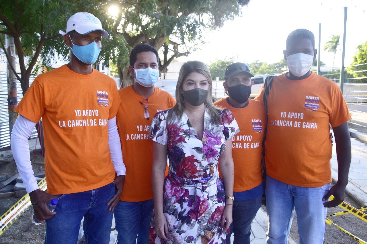 La alcaldesa Virna Johnson estuvo inspeccionando las obras que se adelantan para la construcción de la nueva cancha de Gaira, en la Localidad 3; que contará con grama sintética, gradería cubierta, cerramiento en malla metálica, zonas verdes, áreas administrativas y parque infantil de 93 metros cuadrados.
