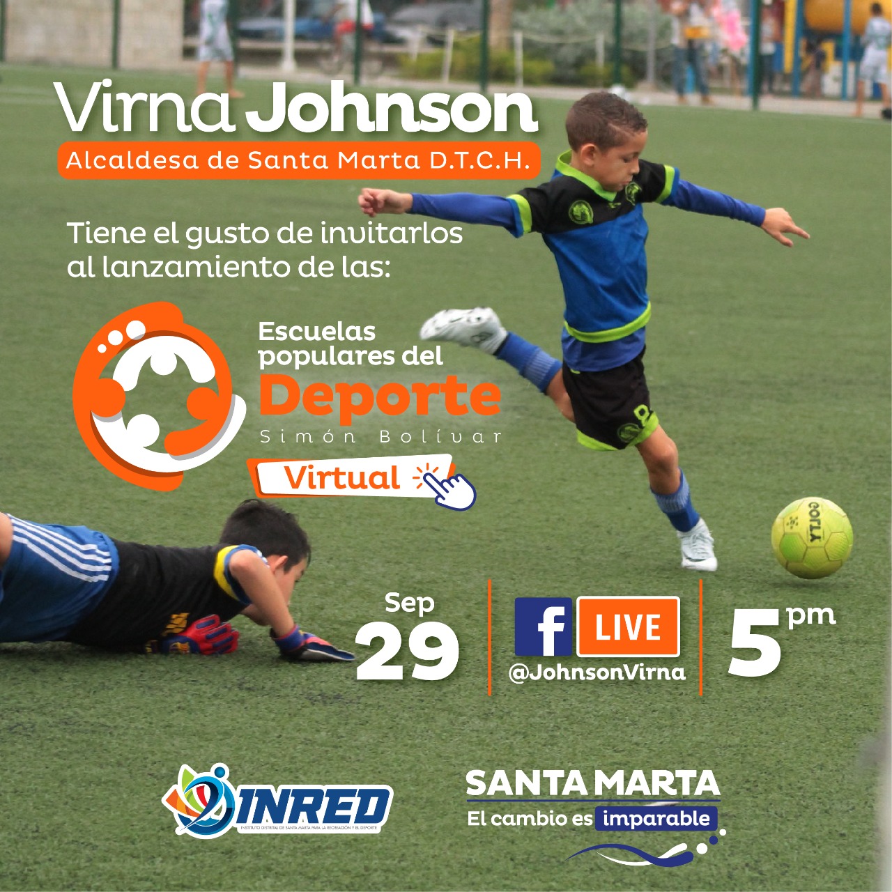 Este martes 29 de septiembre a las 5:00 p.m., la alcaldesa Virna Johnson hará el lanzamiento oficial de las Escuelas Populares del Deporte “Simón Bolívar” de Santa Marta, programa bandera del modelo del cambio, que para este año se desarrollará de manera virtual. La trasmisión de este importante evento se realizará a través de un Facebook Live desde la cuenta de la Alcaldesa @VirnaJohnson. Cabe mencionar, que la meta para lo que resta de este año es beneficiar a más de 4 mil niños, niñas y jóvenes de la ciudad.