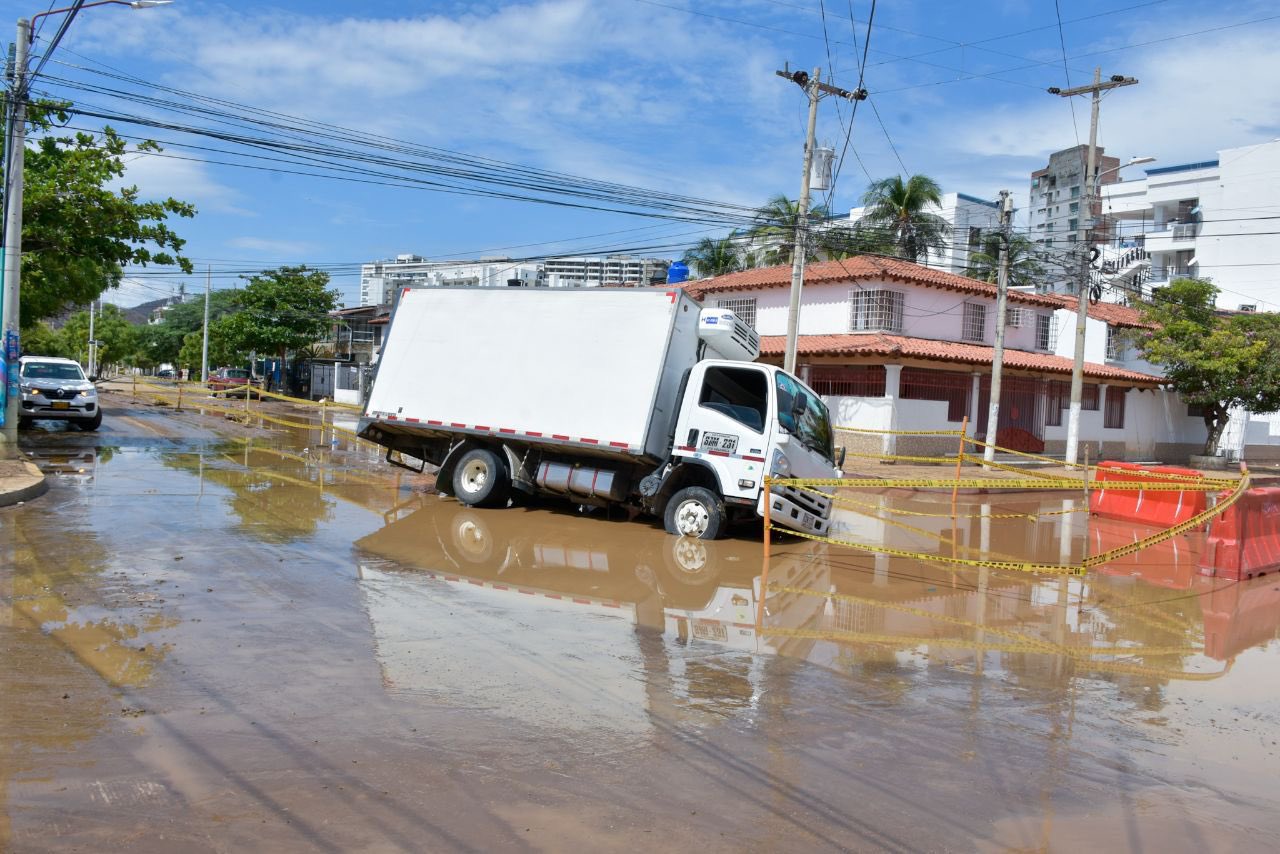 Obras inconclusas en la Avenida Tamacá provocaron un accidente con un camión. Samarios denunciaron falta de mantenimiento y limpiezas en los canales pluviales, lo que permitió los taponamientos e inundaciones.