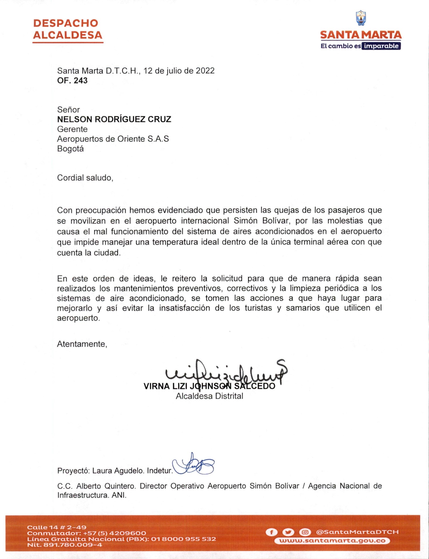 Igualmente indicó qué: “les reitero la solicitud que de manera rápida sean realizados los mantenimientos preventivos, correctivos y la limpieza periódica a los sistemas de aire acondicionado, se tomen las acciones a que haya lugar para mejorarlo y así evitar la insatisfacción de los turistas y samarios que utilicen el aeropuerto”, menciona y requiere la alcaldesa Virna Johnson en el oficio.