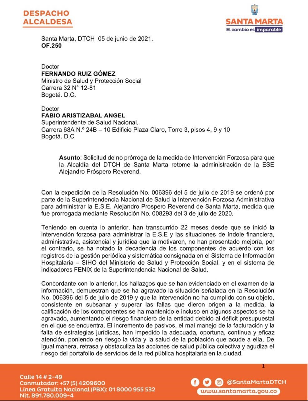 En la solicitud que envió al Ministerio de Salud, la Alcaldesa de Santa Marta le precisa a esta entidad que una intervención forzosa no se puede prorrogar más de una vez y que esa figura, en vez de convertirse en una solución, lo que ha hecho es llevar a la crisis los servicios de salud en el Distrito, impidiendo la adecuada, oportuna, continua y eficaz atención, poniendo en riesgo la vida y la salud de la población que acude a ella.