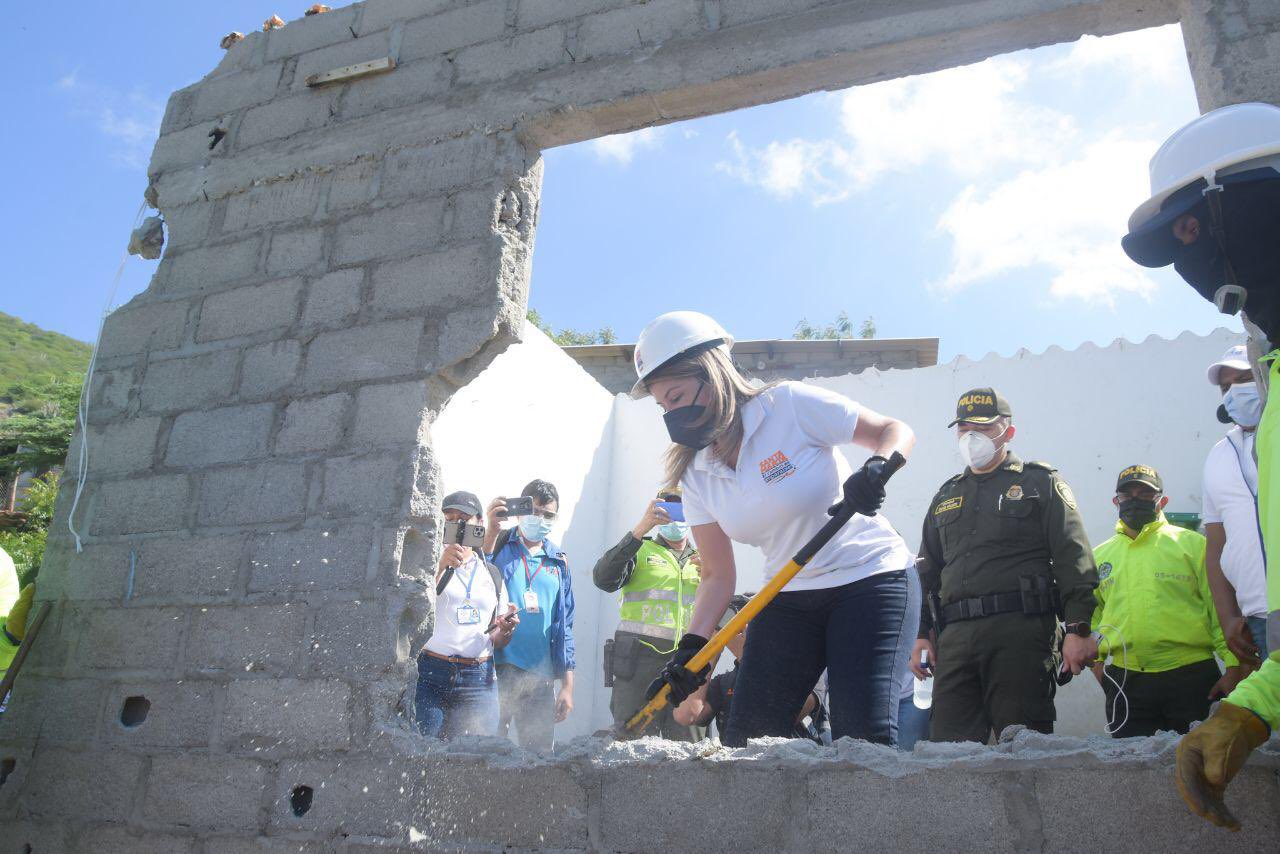 La alcaldesa de Santa Marta, Virna Johnson, demolió una ‘olla’ de microtráfico ubicada en el cerro de La Quemada de Gaira, la primera de una serie de inmuebles que tienen identificadas las autoridades para la lucha contra las bandas criminales, los cuales serán derrumbados dentro del marco de las políticas públicas adoptadas en los consejos de seguridad.
