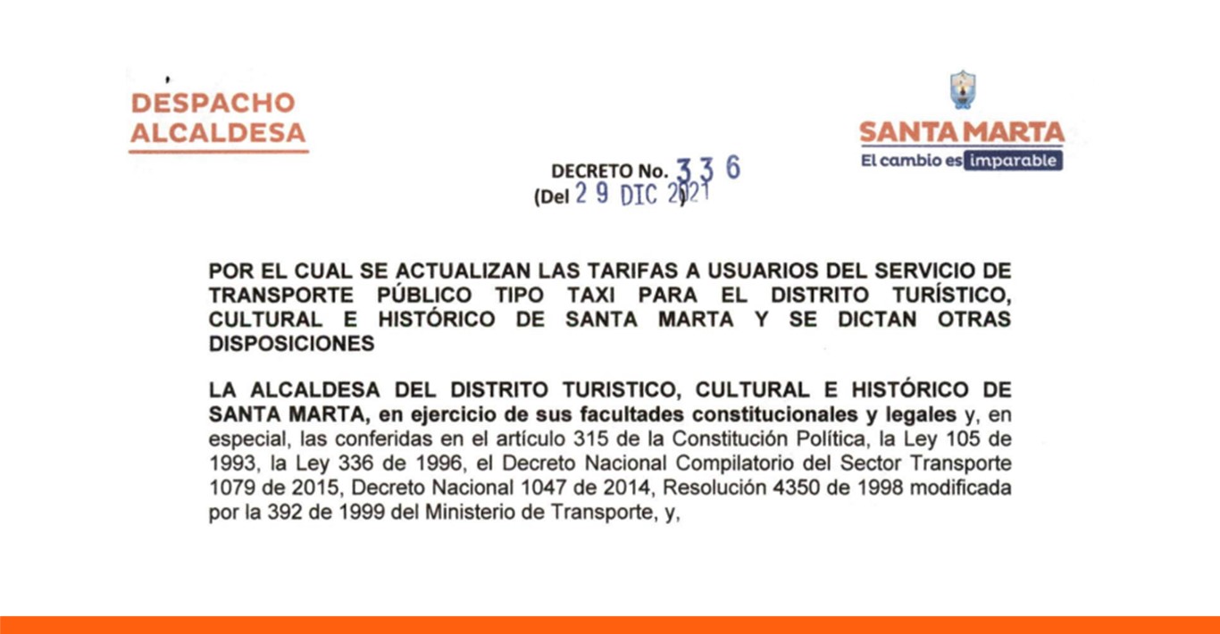 - Decreto No 336 del 29 de diciembre de 2021: "Por el cual se actualizan las tarifas a usuarios del servicio de transporte público tipo taxi para el Distrito Turístico, Cultural e Histórico de Santa Marta y se dictan otras disposiciones"