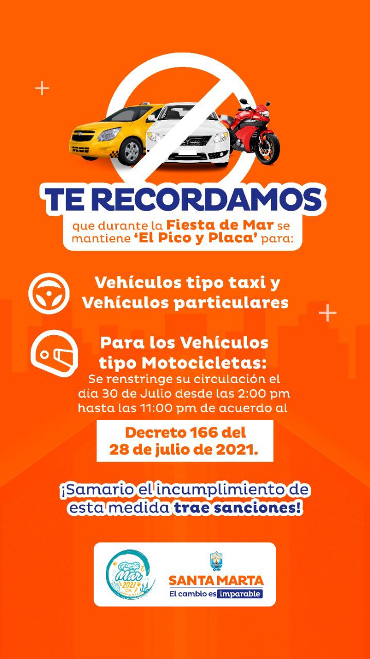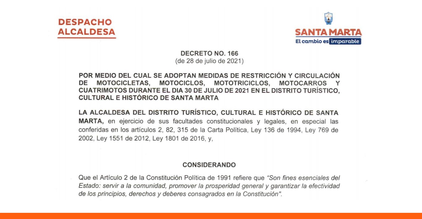 La Alcaldía de Santa Marta expidió el Decreto 166 del 28 de julio de 2021, por medio del cual restringe el tránsito y circulación de los vehículos tipo motocicletas, motociclos, mototriciclos, motocarros y cuatrimotos, durante el día 30 de julio del 2021, desde las 2:00 de la tarde hasta las 11:00 de la noche, en el Distrito.