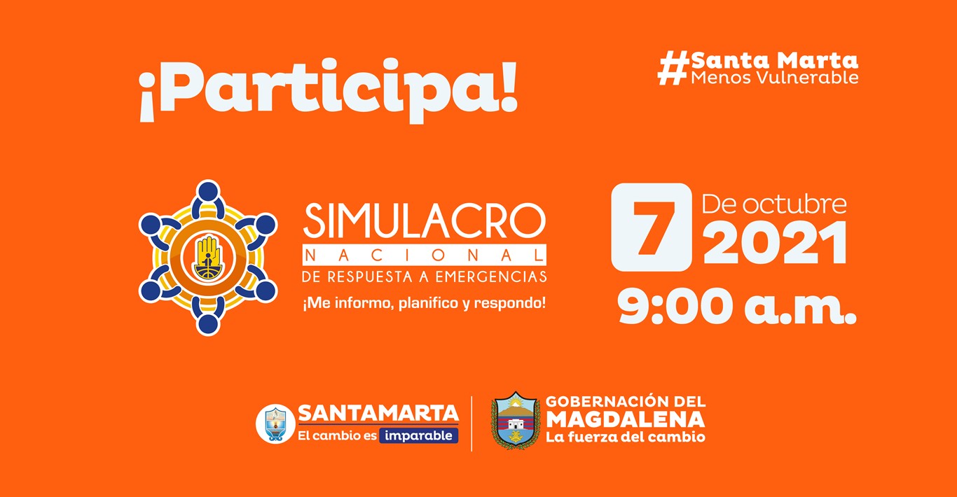 Por instrucciones de la alcaldesa Virna Johnson y del gobernador del departamento del Magdalena, Carlos Caicedo, las Oficinas para la Gestión del Riesgo y el Cambio Climático de Santa Marta (Ogricc) y la Oficina para la Gestión del Riesgo de Desastres del Magdalena (Ogerd), aunarán esfuerzos institucionales para la coordinación del Simulacro Nacional de Respuesta a Emergencias a desarrollarse el próximo jueves 7 de octubre a partir de las 9:00 de la mañana.