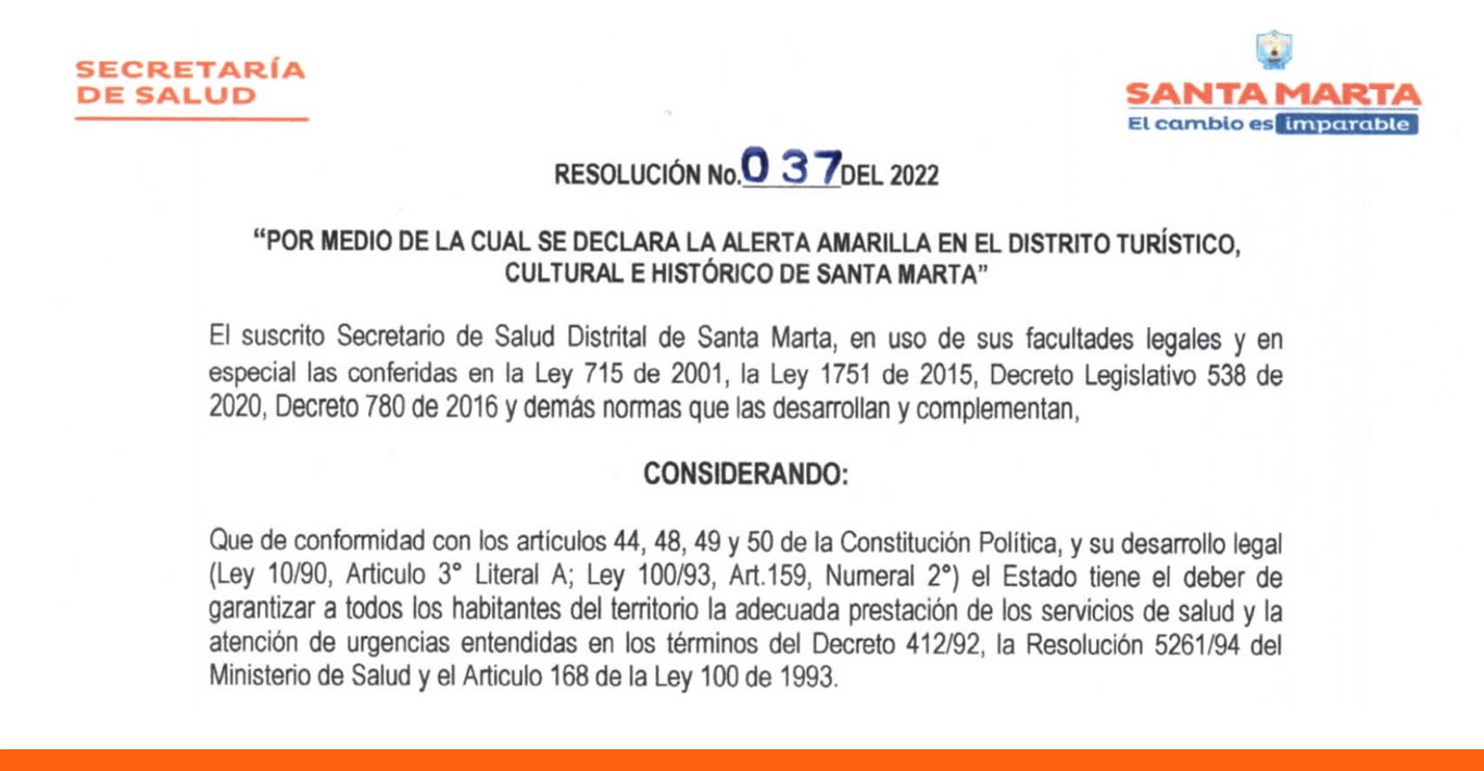 - Resolución No 037 del 2022: "Por medio de la cual se declara la alerta amarilla en el Distrito Turístico, Cultural e Histórico de Santa Marta"