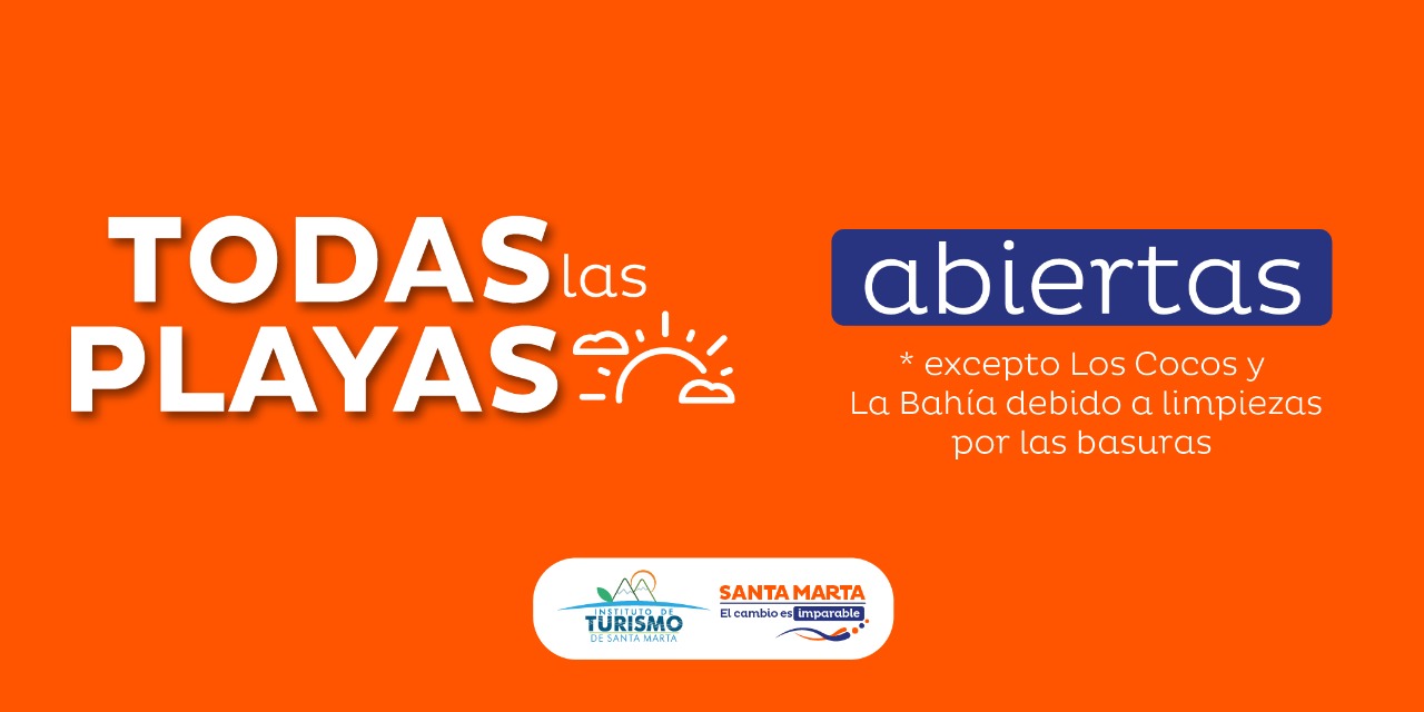 La Alcaldía Distrital de Santa Marta, a través del Instituto Distrital de Turismo - Indetur- informa a samarios, samarias y turistas que el día de hoy 16 de noviembre se encuentra autorizada la apertura de playas del Distrito con excepción de la Playa de Los Cocos y La Bahía debido a que no se encuentran en óptimas condiciones para ingresar por las basuras en el sector que dejó el paso de la tormenta tropical en días pasados. Desde el Distrito se lideran las limpiezas para su pronta apertura.