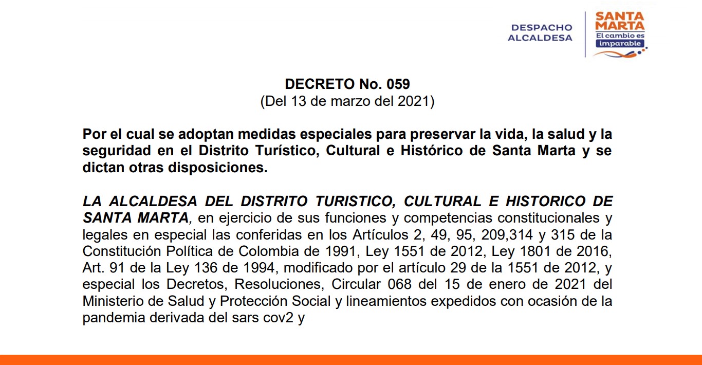 - Decreto No 059 del 13 de marzo de 2021: "Por el cual se adoptan medidas especiales para preservar la vida, la salud y la seguridad en el Distrito Turístico, Cultural e Histórico de Santa Marta y se dictan otras disposiciones"
