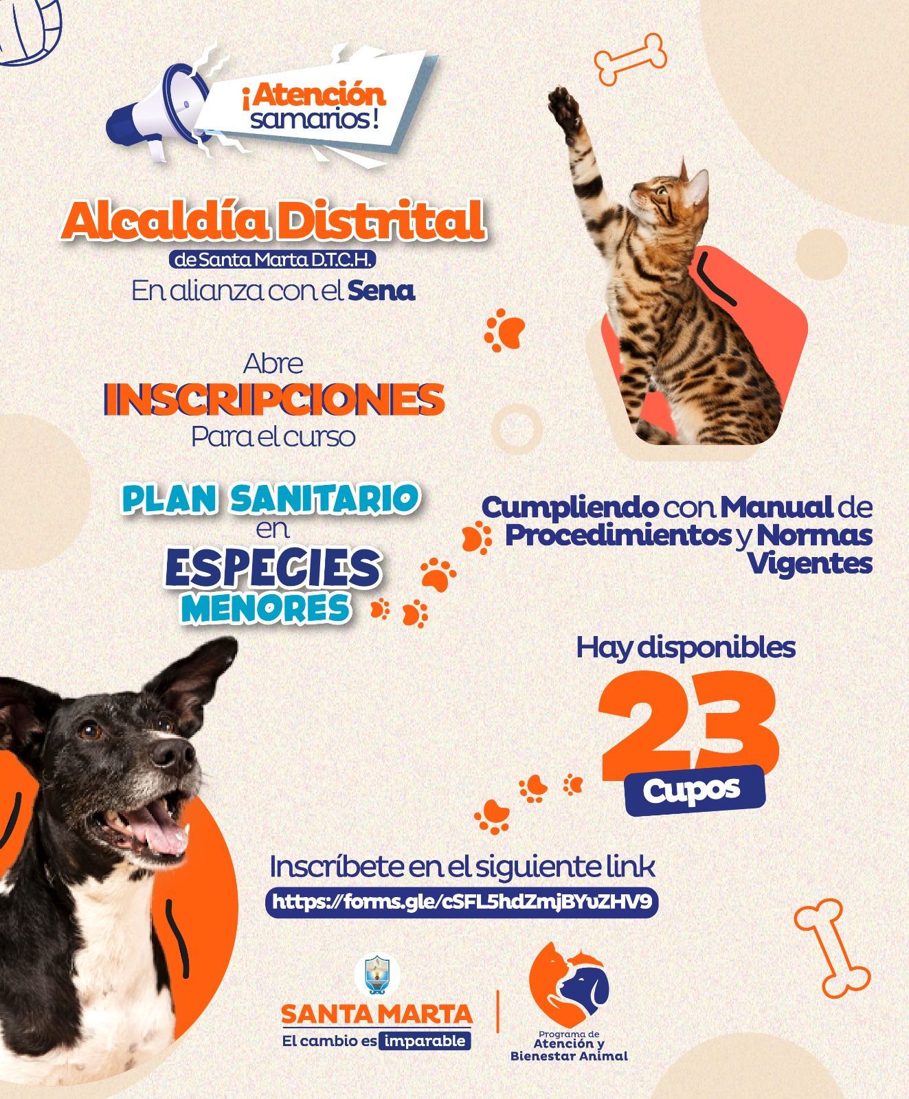 Con el propósito de seguir trabajando a favor del bienestar animal en el Distrito y seguir desarrollando acciones que propenden por la protección de sus derechos, la Alcaldía de Santa Marta, a través de la Secretaría de Gobierno, en alianza con el SENA, abren inscripciones para todos aquellos que quieran capacitarse en el curso “Plan sanitario en especies menores cumpliendo con manual de procedimientos y normas vigentes”.