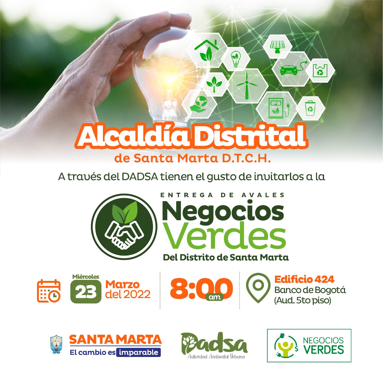 La ingeniera, Sara Candanoza, directora del Departamento Administrativo Distrital de Sostenibilidad Ambiental, DADSA, indicó que, el marco del Plan de Acción 2021-2023 ‘Comprometidos con el ambiente’, articulado con el Plan de Desarrollo Distrital 2020-2023 ‘Santa Marta, Corazón del Cambio’, se contempló la meta de crear una ventanilla distrital de ‘Negocios Verdes’, dentro del cual se diseñó un plan de acción para la promoción de estos en el distrito de Santa Marta.