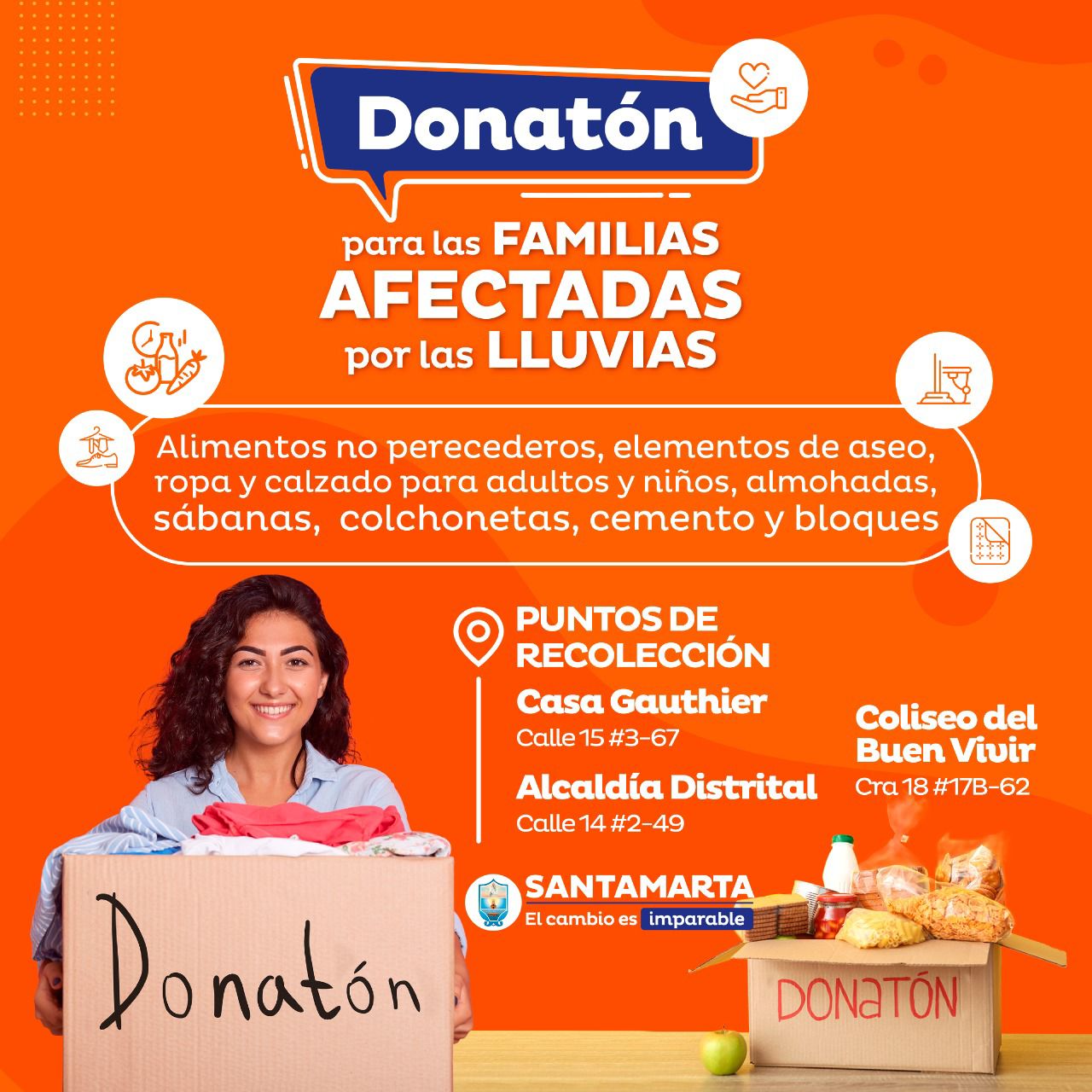 Los tres puntos habilitados son: Casa Gauthier, ubicada en la calle 15 #3-67; Alcaldía Distrital, en la calle 14 #2-49 y Coliseo del Buen Vivir, carrera 18 #17B-62, donde se estarán recibiendo las donaciones que serán entregadas a los samarios afectados por los estragos de la ola invernal.