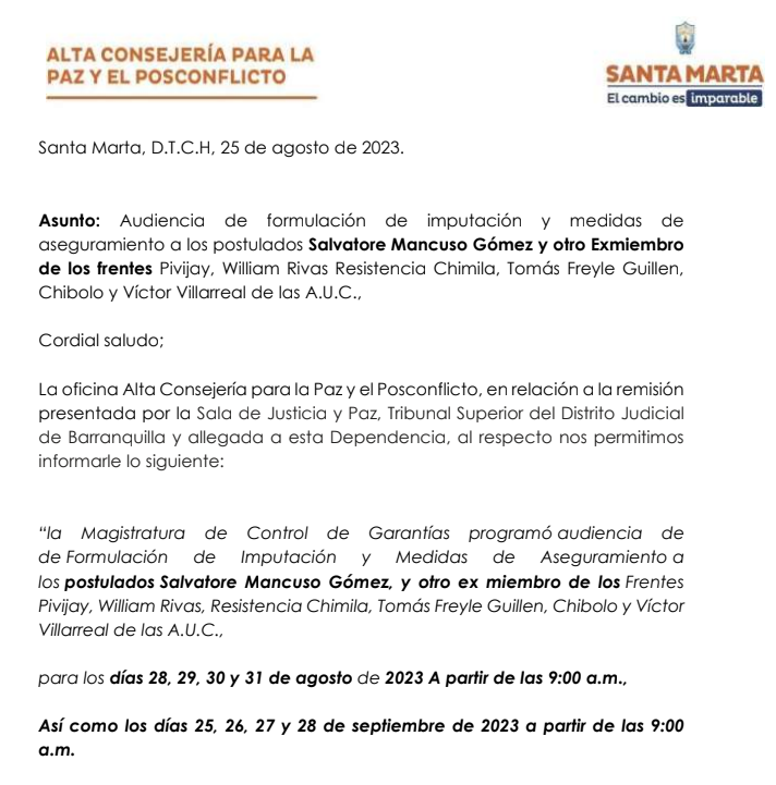 “La Magistratura de Control de Garantías programó audiencia de formulación de imputación y medidas de aseguramiento a los postulados Salvatore Mancuso Gómez, y otros ex miembros de los Frentes Pivijay, William Rivas, Resistencia Chimila, Tomás Freyle Guillén, Chibolo y Víctor Villarreal de las A.U.C., para los días 28, 29, 30 y 31 de agosto de 2023 a partir de las 9:00 a.m.