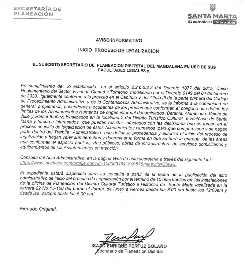 La Secretaría de Planeación Distrital, en cabeza de Isaac Pertuz Bolaño, que tiene a su cargo la ejecución de este programa, convoca a la comunidad en general, propietarios, poseedores u ocupantes de los predios que conforman el polígono que define los límites de estos asentamientos humanos de origen informal, así como a los terceros interesados que puedan resultar afectados con las decisiones que se tomen en el proceso legalización, para que comparezcan y se hagan parte del trámite administrativo que define la procedencia y autoriza el inicio del proceso de legalización, con el fin de que hagan valer sus derechos y determinar la forma en que se hará la entrega de las áreas que conforman el espacio público, vías públicas, obras de infraestructura de servicios domiciliarios y equipamientos de los sectores en mención.