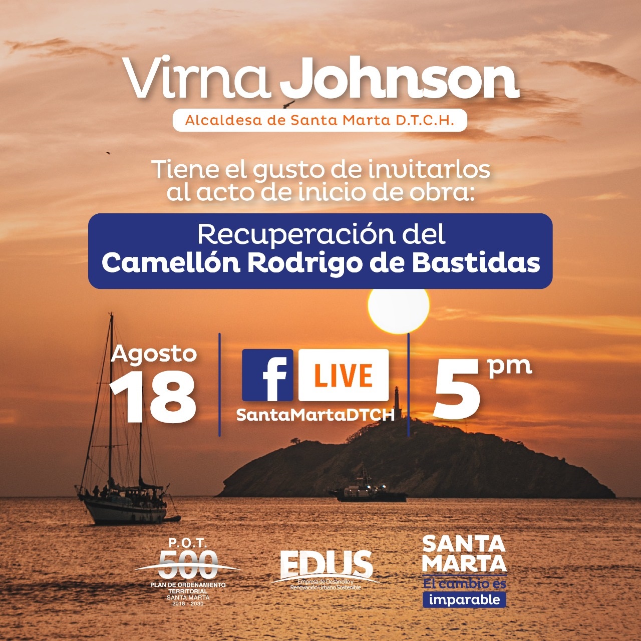Gracias a la gestión de la Alcaldía Distrital a través de la Empresa de Desarrollo y Renovación Urbana de Santa Marta, EDUS, este martes 18 de agosto, a las cinco de la tarde se realizará el acto de inicio de las obras de recuperación del emblemático Camellón ‘Rodrigo de Bastidas’. La actividad será transmitida en vivo a través de la página de Facebook de la Alcaldía con el objetivo que lo samarios conozcan detalles de este importante proyecto.