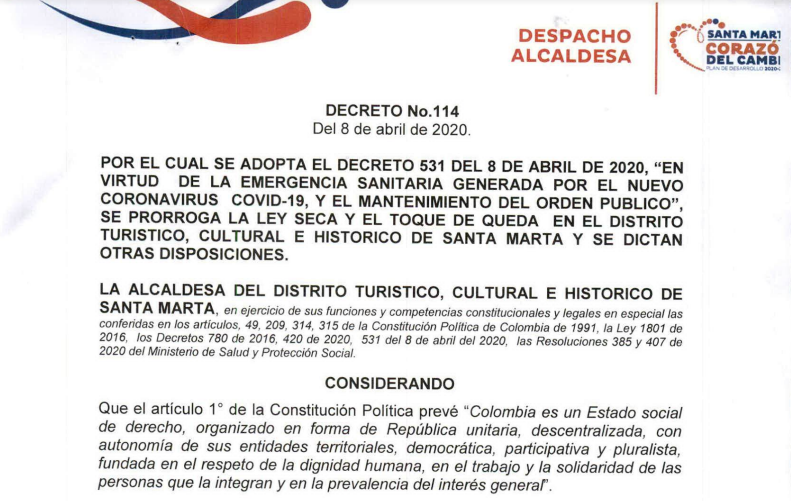 - Decreto No 114 del 8 de Abril de 2020: "Por el cual se adopta el Decreto # 531 del 8 de Abril de 2020, "En virtud de la emergencia sanitaria generada por el nuevo coronavirus COVID-19, y el mantenimiento del orden público" se prorroga la Ley Seca y el Toque de Queda en el Distrito Turístico, Cultural e Histórico de Santa Marta y se dictan otras disposiciones"