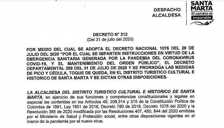 - Decreto No 212 del 31 de Julio de 2020: "Por medio del cual se adopta el Decreto Nacional 1076 del 28 de Julio del 2020 <<Por el cual se imparten instrucciones en virtud de la emergencia sanitaria generada por la pandemia del coronavirus COVID-19, y el mantenimiento del orden público>>, el Decreto Departamental 259 del 31 de julio de 2020 y se prorroga las medidas de pico y cédula, toque de queda en el Distrito Turístico, Cultural e Histórico de Santa Marta y se dictan otras disposiciones"