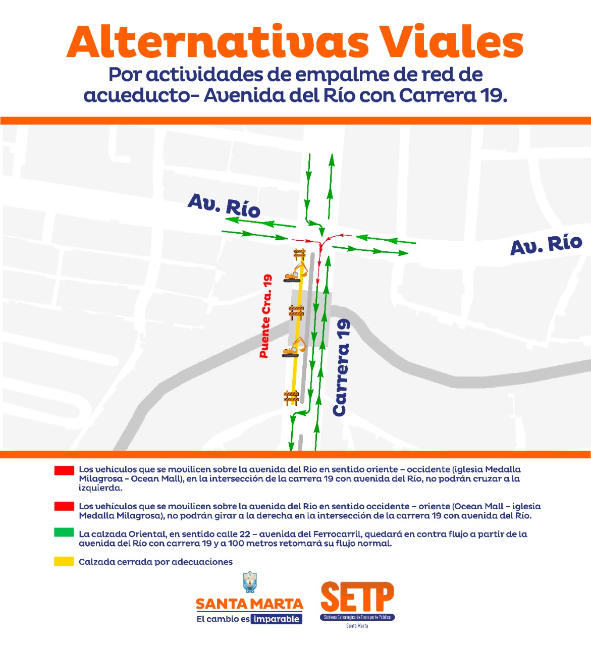 Dando cumplimiento a las directrices de la alcaldesa Virna Johnson, la Secretaría de Movilidad Multimodal y Sostenible del Distrito de Santa Marta, informa a la comunidad el permiso de cierre temporal de la calzada sur-occidente de la avenida del Río con carrera 19, en la cual el Sistema Estratégico de Transporte Público-SETP-, estará desarrollando las obras de empalme de la red de acueducto nuevo al existente, en el marco del desarrollo del proyecto de recuperación de la avenida del Río.