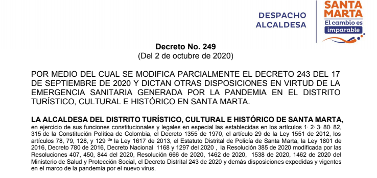 La Alcaldía de Santa Marta expidió el Decreto 249 del 2 de octubre de 2020, por medio del cual modifica parcialmente el Decreto 243 del pasado 17 de septiembre y se dictan otras disposiciones en virtud de la emergencia sanitaria generada por la pandemia en el Distrito.