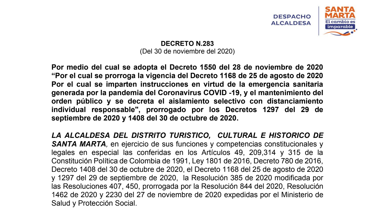 - Decreto No 283 del 30 de noviembre de 2020: "Por medio del cual se adopta el Decreto 1550 del 28 de noviembre de 2020 “Por el cual se prorroga la vigencia del Decreto 1168 de 25 de agosto de 2020 Por el cual se imparten instrucciones en virtud de la emergencia sanitaria generada por la pandemia del Coronavirus COVID -19, y el mantenimiento del orden público y se decreta el aislamiento selectivo con distanciamiento individual responsable", prorrogado por los Decretos 1297 del 29 de septiembre de 2020 y 1408 del 30 de octubre de 2020"