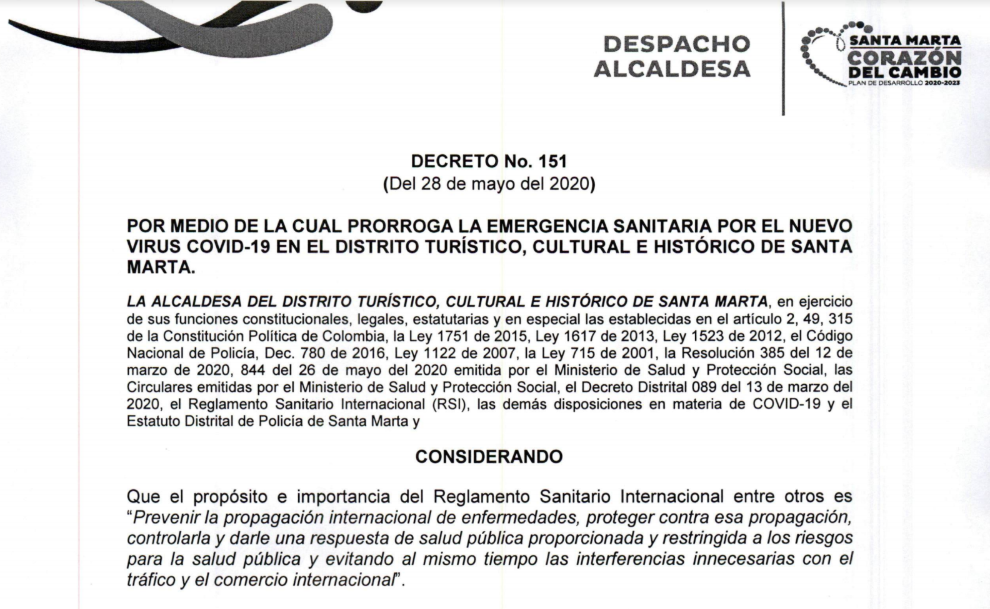 - Decreto No 151 del 28 de mayo de 2020: "Por medio de la cual se prorroga la emergencia sanitaria por el nuevo virus COVID-19 en el Distrito Turístico, Cultural e Histórico de Santa Marta"