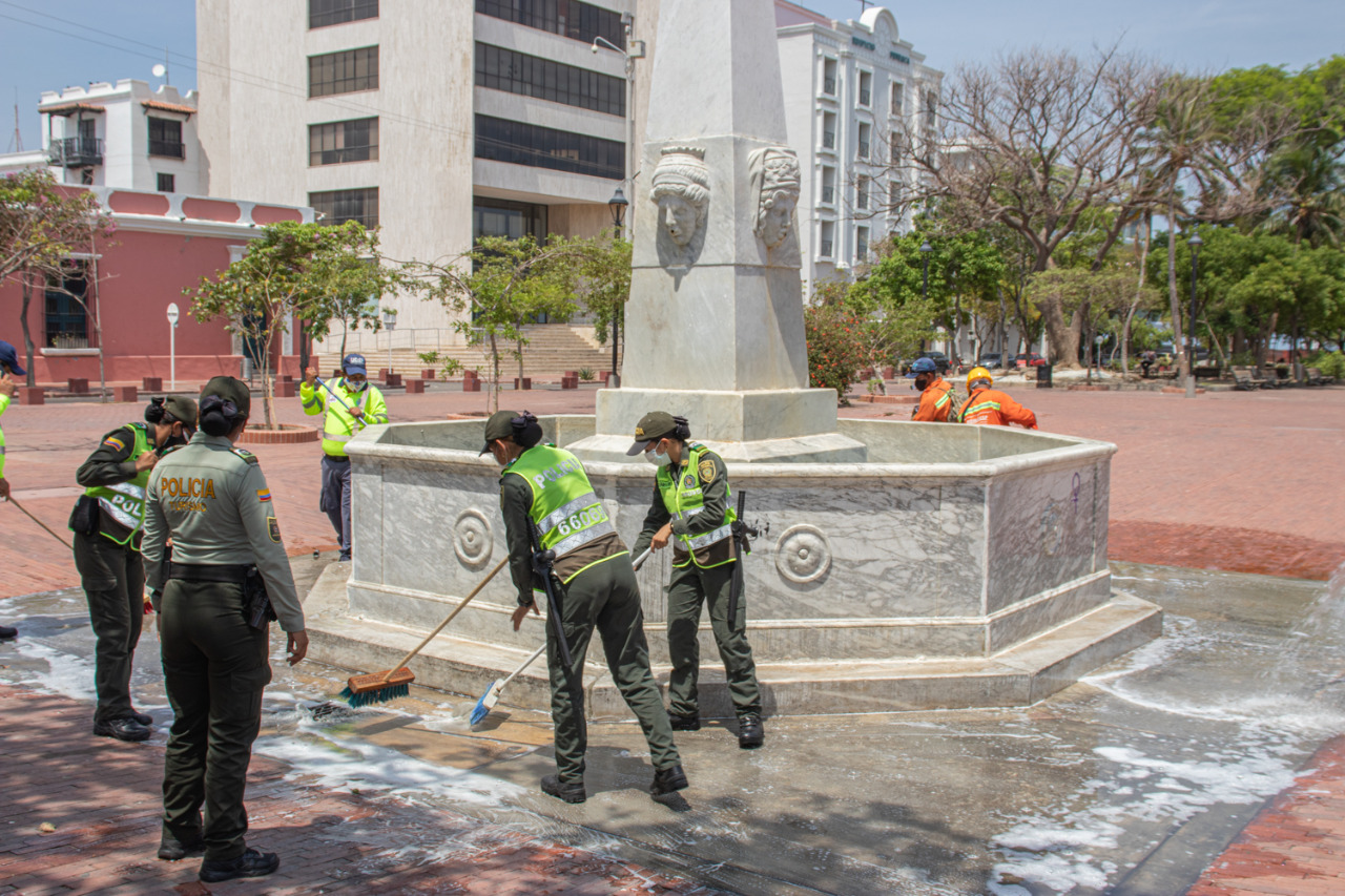 La Alcaldía Distrital, por medio de la Secretaría de Gobierno, realizó una jornada de limpieza a los monumentos de Simón Bolívar y al de las Cariátides (Fuente de las Cuatro Caras), ubicados en el Centro Histórico de Santa Marta.