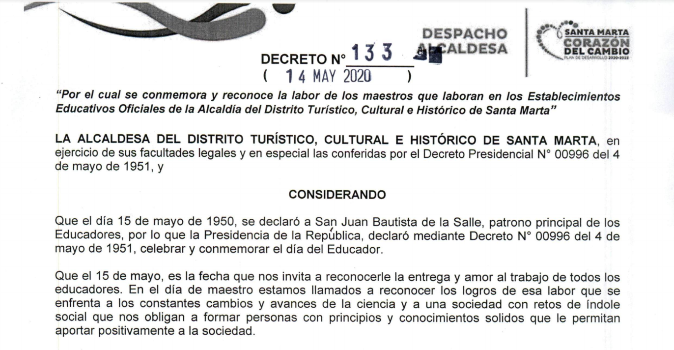 - Decreto No 133 del 14 de mayo de 2020: "Por el cual se conmemora y reconoce la labor de los maestros que laboran en los establecimientos educativos oficiales de la Alcaldía del Distrito Turístico, Cultural e Histórico de Santa Marta"