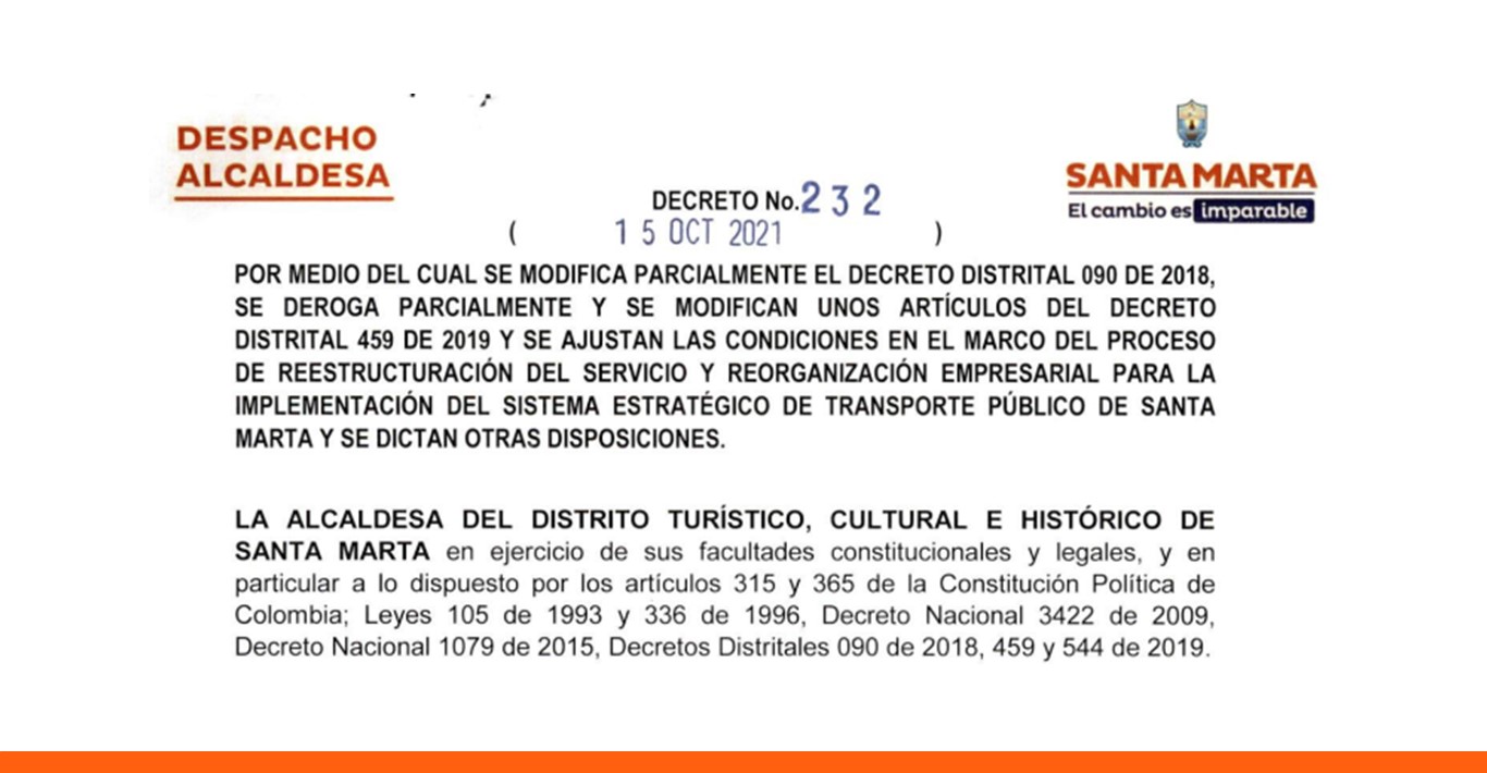- Decreto No 232 del 15 de Octubre de 2021: "Por medio del cual se modifica parcialmente el Decreto Distrital 090 de 2018, se deroga parcialmente y se modifican unos artículos del Decreto Distrital 459 de 2019 y se ajustan las condiciones en el marco del Proceso de Reestructuración del servicio y reorganización empresarial para la implementación del Sistema Estratégico de Transporte Público de Santa Marta y se dictan otras disposiciones"