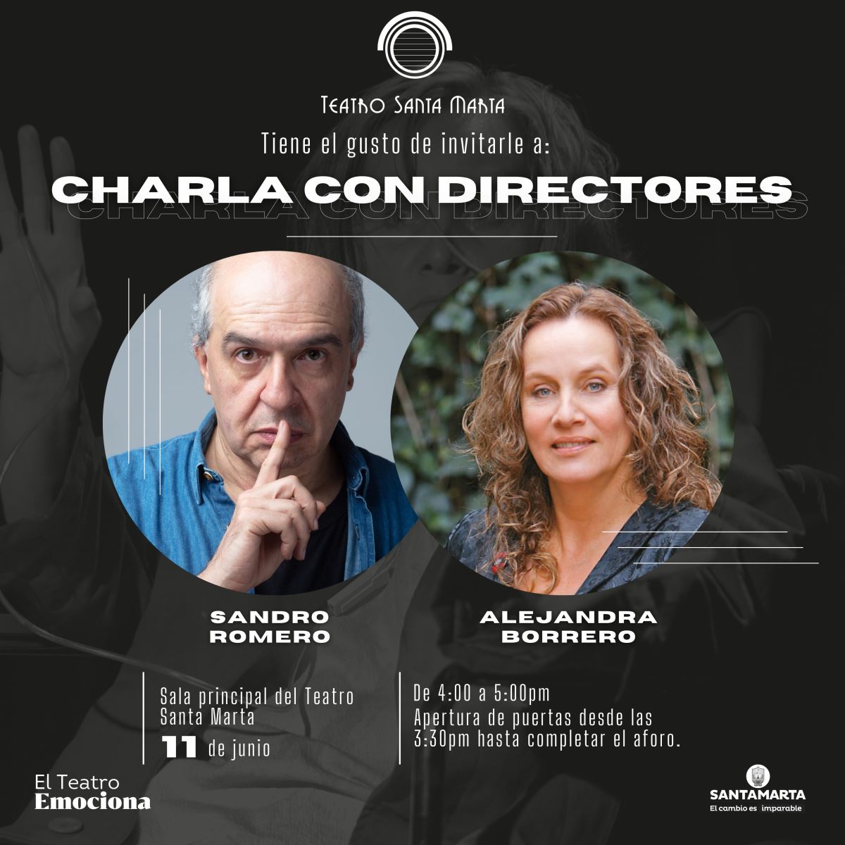 Esta charla será el mismo sábado 11 de junio a las 4:00 pm. en la sala principal del Teatro Santa Marta.