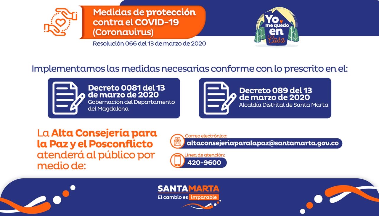 En el marco de las medidas de protección asumidas por el Gobierno Departamental y la Alcaldía Distrital de Santa Marta, en cabeza de la Alcaldesa Virna Johnson; la Alta Consejería para la Paz y el Posconflicto cerró temporalmente los mecanismos de atención personal en sus oficinas y en el Centro Regional de Atención a Víctimas.