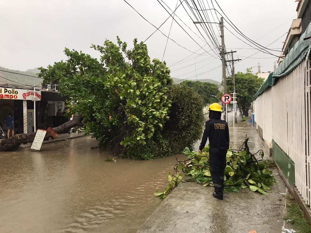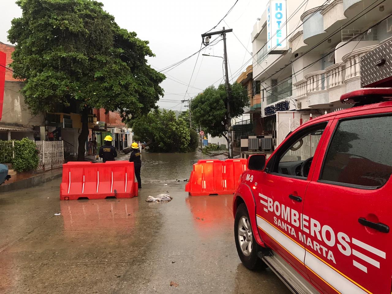 El Cuerpo de Bomberos Voluntarios de Santa Marta, registró y atendió el colapso de una muralla de concreto en el barrio Primero de Mayo, calle 34 carrera 21. La misma entidad prestadora del servicio de emergencia, atendió incidente por caída de un árbol sobre la calle 6 con carrera 4 de Gaira, que comprometió amenaza tecnológica por caída de redes eléctricas.