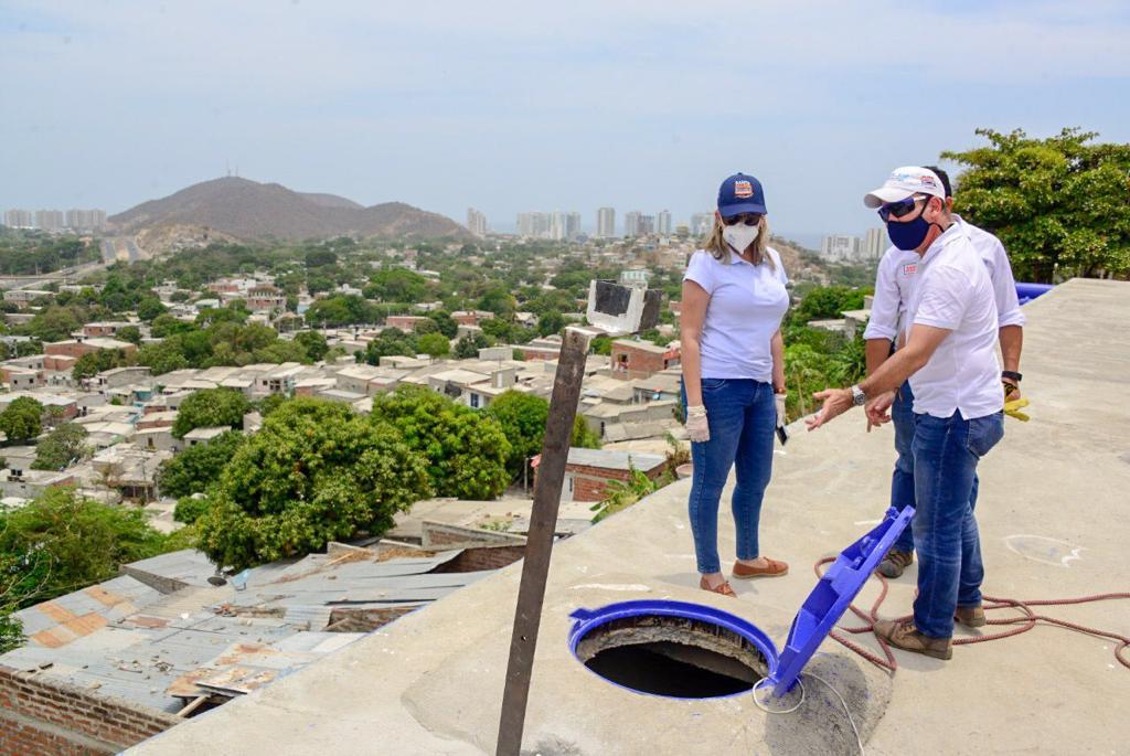 La alcaldesa de Santa Marta, Virna Johnson junto al gerente de la Empresa de Servicios Públicos- Essmar-, José Dajud, supervisó los trabajos de adecuación del tanque de abastecimiento de agua potable ‘Café Sello Rojo’ , ubicado en el barrio Nueva Bettel de Gaira, el cual al ser habilitado mejorará la continuidad en el servicio beneficiando a más de 18 mil familias de la ciudad.