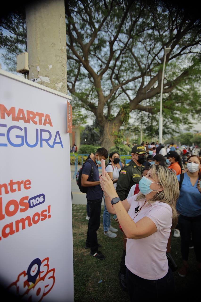 Con el lanzamiento del programa ‘Santa Marta Más Segura, ¡Entre todos nos cuidamos!’ la mandataria socializó, en compañía del comandante de la Policía Metropolitana, coronel Jesús de los Reyes, la iniciativa de ‘Puntos Seguros’ e invitó a la ciudadanía a descargar en sus celulares la aplicación y escanear los códigos QR que estén cerca de sus lugares de residencia.