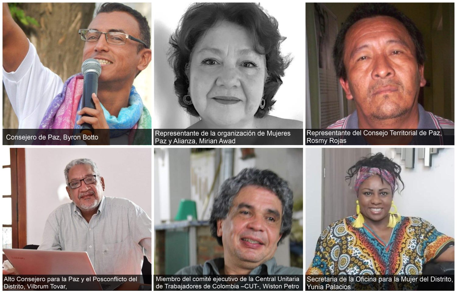 El también consejero de Paz, Byron Botto, quien resaltó la campaña que se adelanta en los barrios sobre los pactos de convivencia y paz desde la diversidad; la representante de la organización de mujeres Paz y Alianza , Mirian Awad, quien se referió al escenario de pandemia para las mujeres; y el miembro del comité ejecutivo de la Central Unitaria de Trabajadores de Colombia –CUT-, Wiston Petro, el cual se pronunció sobre la reparación colectiva del movimiento sindical como víctimas del conflicto, paz, soberanía, democracia y derechos laborales.