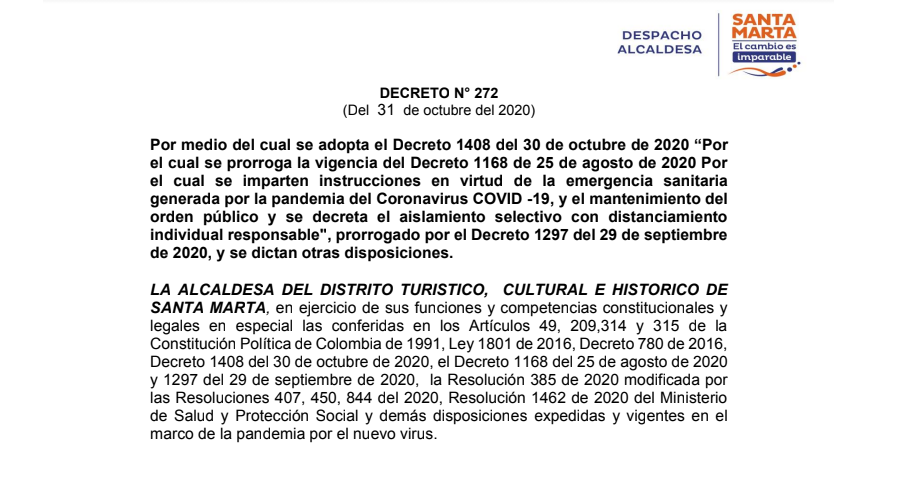 - Decreto No 272 del 31 de octubre de 2020: "Por medio del cual se adopta el Decreto 1408 del 30 de octubre de 2020 “Por el cual se prorroga la vigencia del Decreto 1168 de 25 de agosto de 2020 Por el cual se imparten instrucciones en virtud de la emergencia sanitaria generada por la pandemia del Coronavirus COVID -19, y el mantenimiento del orden público y se decreta el aislamiento selectivo con distanciamiento individual responsable", prorrogado por el Decreto 1297 del 29 de septiembre de 2020, y se dictan otras disposiciones"