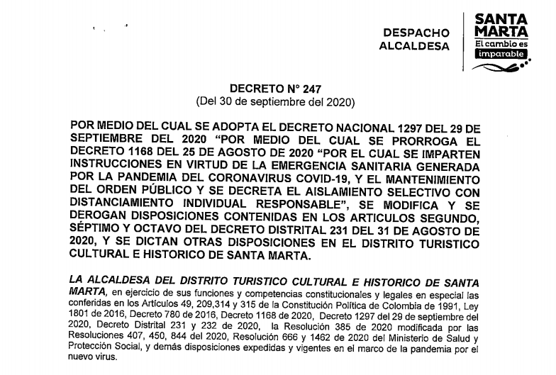 - Decreto No 247 del 30 de septiembre de 2020: "Por medio del cual se adopta el Decreto Nacional 1297 del 29 de Septiembre de 2020 "por medio del cual se prorroga el Decreto 1168 del 25 de Agosto de 2020 "por el cual se imparten instrucciones en virtud de la emergencia sanitaria generada por la pandemia del Coronavirus Covid-19, y el mantenimiento del orden público y se decreta el aislamiento selectivo con distanciamiento individual responsable", se modifica y se derogan disposiciones contenidas en los articulos segundo, séptimo y octavo del decreto Distrital 231 del 31 de agosto de 2020, y se dictan otras disposiciones en el Distrito Turístico, Cultural e Histórico de Santa Marta"