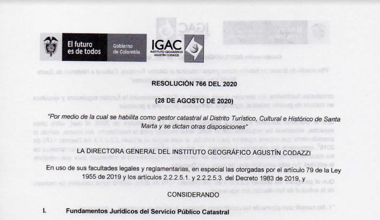 - Resolución No 766 del 28 de agosto de 2020 - Instituto Geográfico Agustín Codazzi: "Por medio de la cual se habilita como gestor catastral al Distrito Turístico, Cultural e Histórico de Santa Marta y se dictan otras disposiciones"