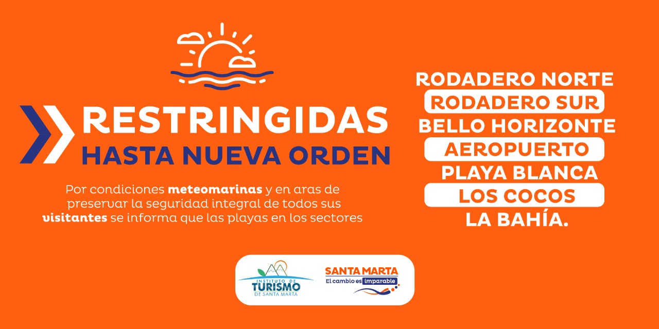 Teniendo en cuenta las condiciones meteo marinas imperantes en nuestro territorio, según lo expuesto en el comunicado informativo de la Dirección General Marítima- DIMAR, se restringe de manera indefinida el ingreso para el uso y disfrute de las playas en los sectores de El Rodadero Norte, Rodadero Sur, Bello Horizonte (Cabo Tortuga, Costa Brava, Playa Dormida, Playa Salguero, Zuana, Irotama), Playa Aeropuerto, Playa Blanca, Playa Los Cocos y La Bahía, debido al tránsito por el Caribe de una onda tropical que tiene 80% de posibilidad de alcanzar la categoría de ciclón tropical, el cual se aproxima al país acompañado de lluvias, tormentas eléctricas, vientos fuertes y oleaje por encima de lo normal.