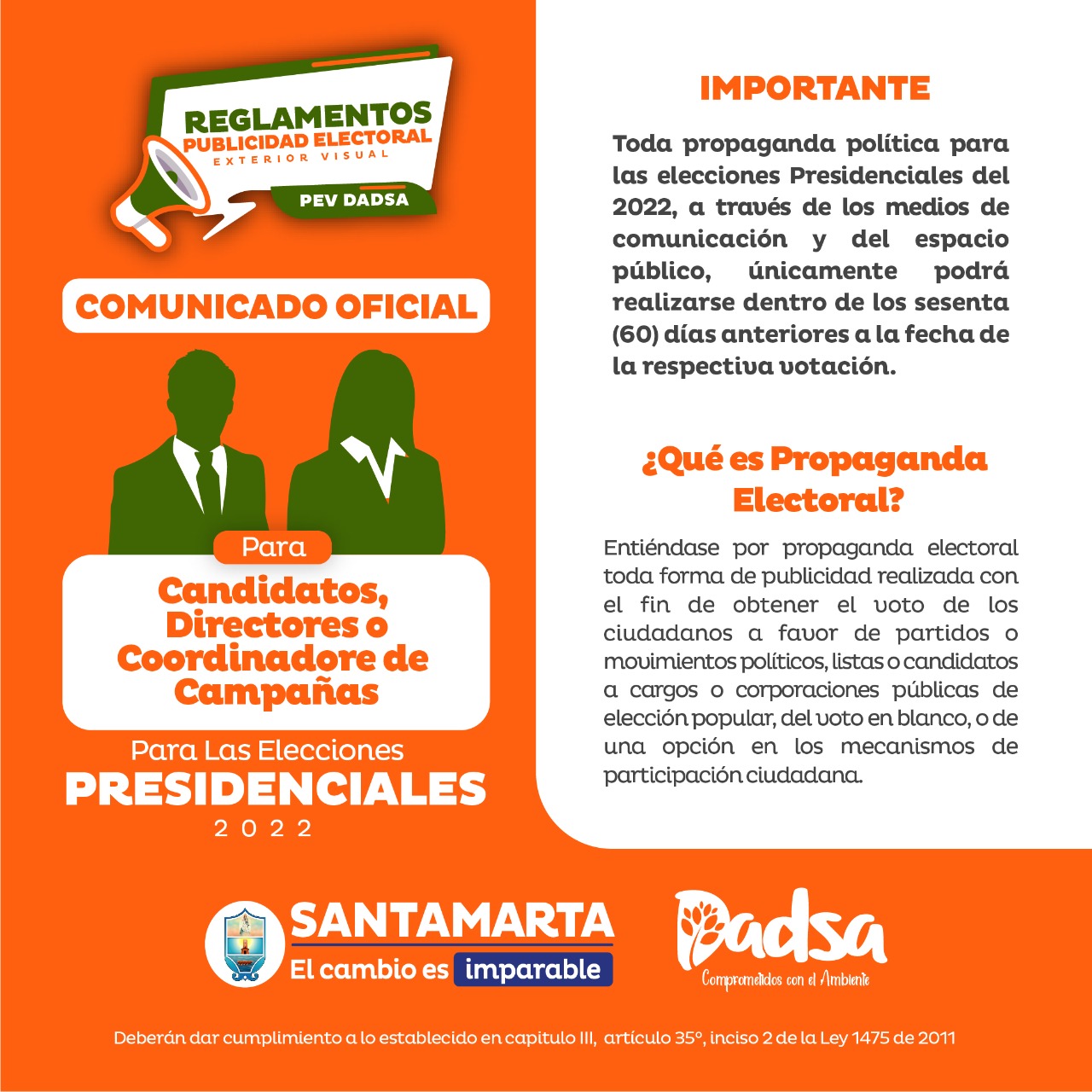 La Alcaldía Distrital de Santa Marta, a través de la dirección general del Departamento Administrativo Distrital de Sostenibilidad Ambiental- DADSA, en ejercicio de las facultades que le confiere el Acuerdo Distrital N° 016 del 27 de noviembre de 2002, el Acuerdo Distrital N° 005 del 27 de noviembre de 2003 y el Acuerdo N° 002 del 27 de febrero de 2012, como máxima autoridad ambiental en el área urbana del Distrito Turístico, Cultural e Histórico de Santa Marta, por disposición de la Alcaldía Distrital, se permite comunicar a los partidos y movimientos políticos, movimientos sociales y grupos significativos de ciudadanos para las elecciones presidenciales(Candidatos, directores y/o coordinadores de campaña electoral), que deberán dar cumplimiento a lo establecido en capitulo III, artículo 35°, inciso 2 de la Ley 1475 de 2011 “Por la cual se adoptan reglas de organización y funcionamiento de los partidos y movimientos políticos, de los procesos electorales y se dictan otras disposiciones”, el cual señala: “la propaganda a través de los medios de comunicación social y del espacio público, únicamente podrá realizarse dentro de los sesenta (60) días anteriores a la fecha de la respectiva votación”.