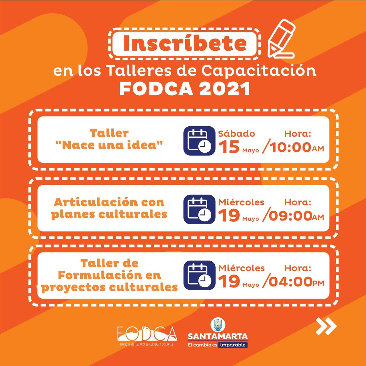 Estos talleres de capacitación se desarrollan en el marco de la Convocatoria 2021 del Fondo Distrital para la Cultura y las Artes – FODCA, implementada con el objetivo de reactivar al sector, uno de los más afectados por la pandemia del Covid-19.