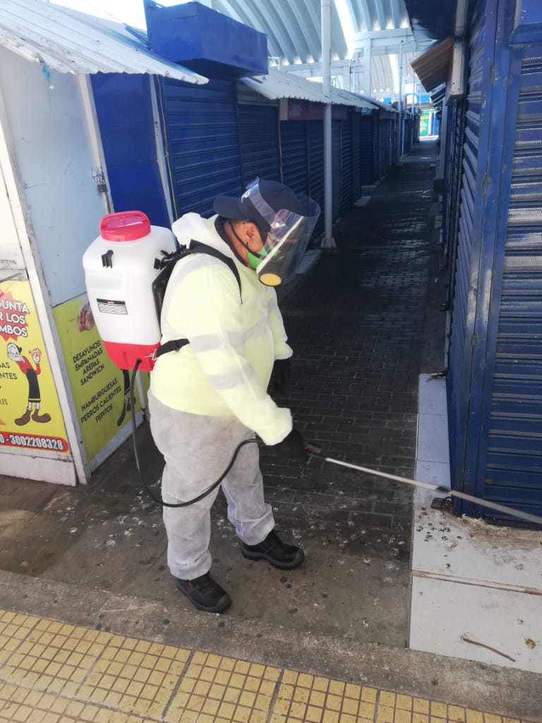 En la jornada se intervino todo el edificio del mercado (pabellón de víveres y abarrotes, zona de verduras, carnes, sector de comidas y parqueadero) así mismo la galería comercial, esto con el producto amonio cuaternario de quinta generación, el cual elimina bacterias, virus y hongos y no genera reacciones a quienes entran en contacto con este líquido, con el fin de que estos entornos ofrezcan condiciones seguras para evitar el contagio del coronavirus.