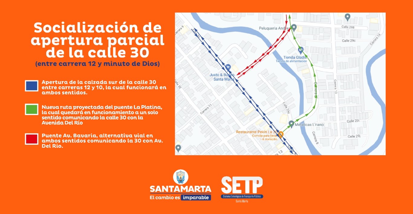 La Alcaldía Distrital de Santa Marta, a través del Sistema Estratégico de Transporte Público -SETP- informa a la comunidad que a partir del miércoles 8 de septiembre se realizará la apertura parcial de la calzada sur de la calle 30, entre carreras 12 y 10, la cual funcionará en doble sentido para el tránsito vehicular como parte de los trabajos en la obra de ampliación de este importante sector de la ciudad.