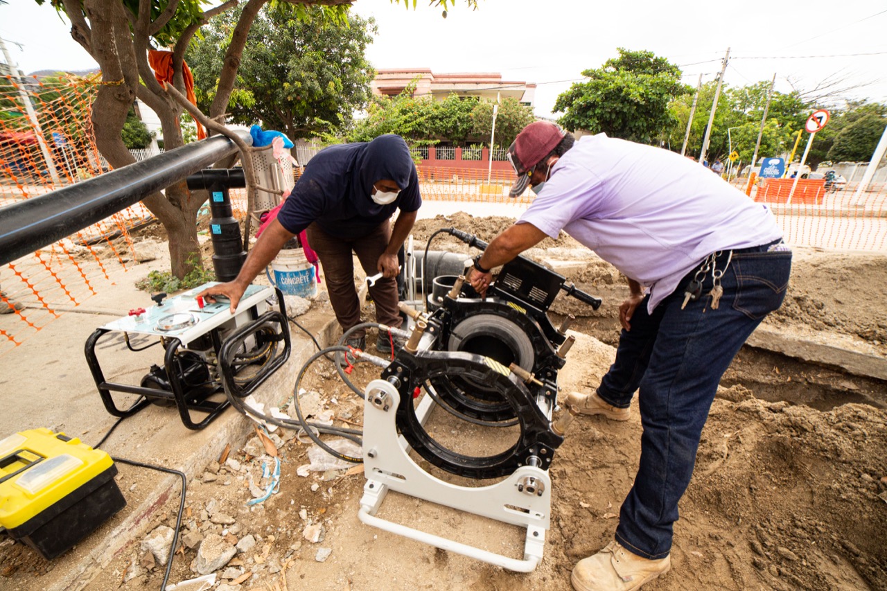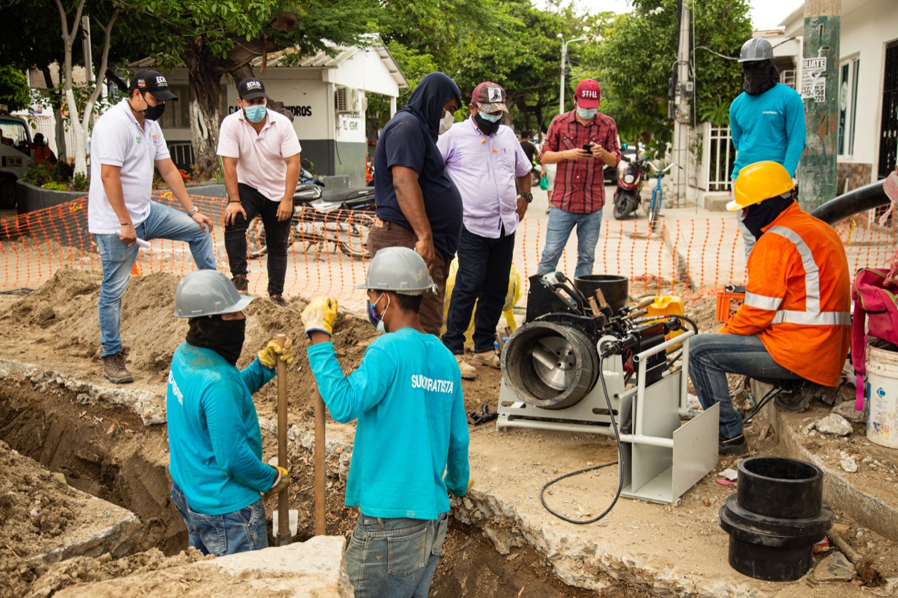 Dando un salto significativo para el mejoramiento del suministro de agua potable a la zona Norte de la ciudad, la Alcaldía de Santa Marta a través de la Empresa de Desarrollo y Renovación Urbano Sostenible de Santa Marta, EDUS, y la Empresa de Servicios Públicos del Distrito, ESSMAR, realiza los trabajos de empalme de la tubería de 14 pulgadas, en la carrera 19 entre calles 5 y 11 del barrio Los Almendros.