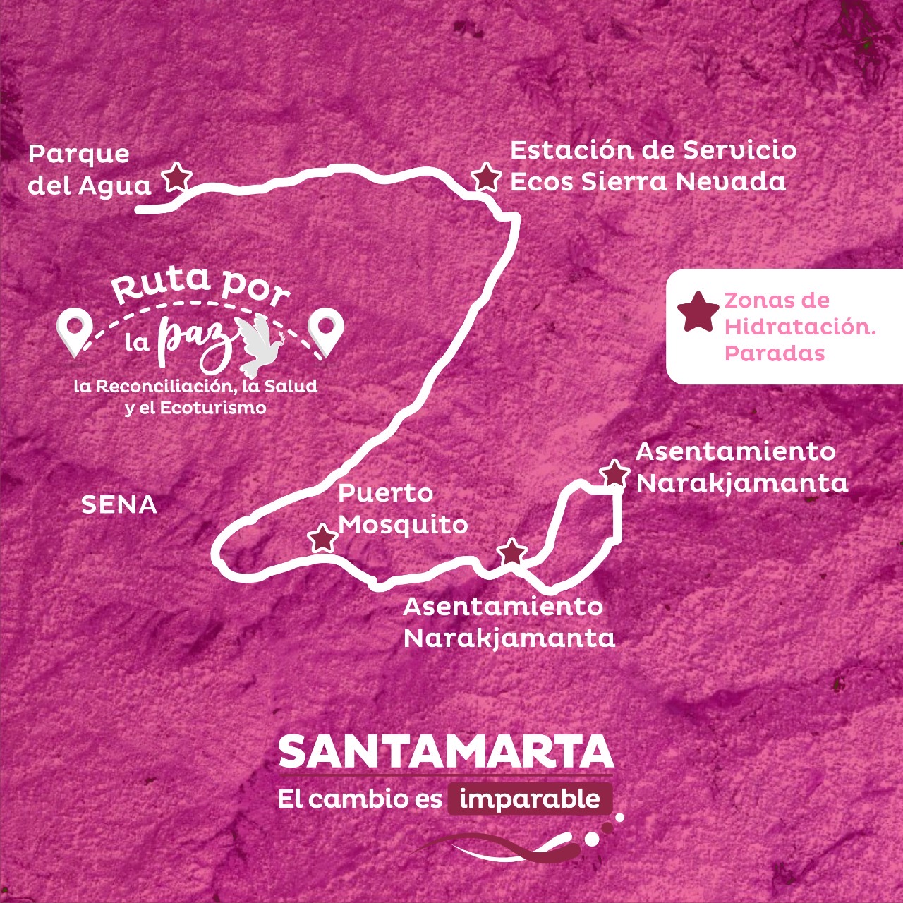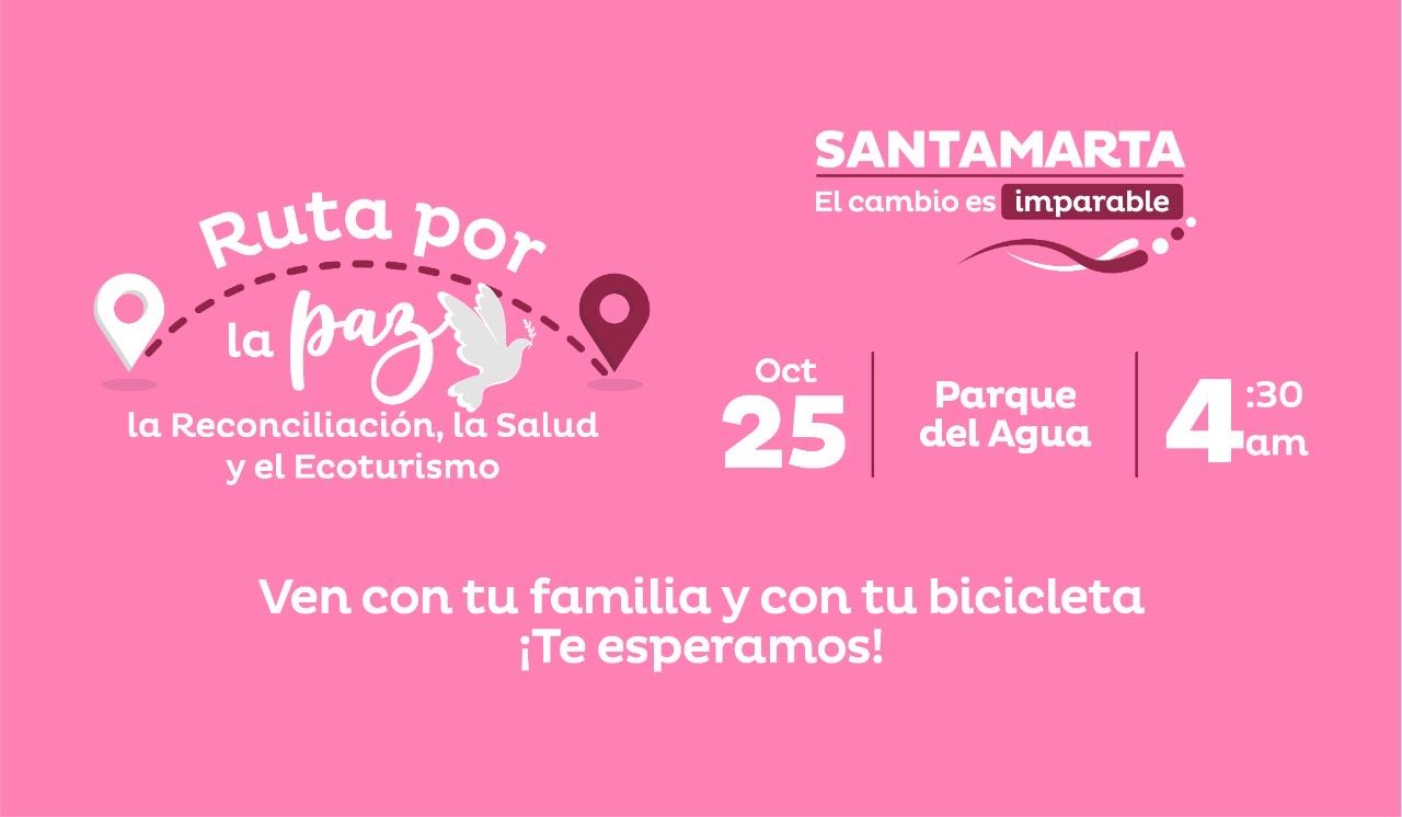 La administración distrital a través de la Alta Consejería para la Paz y el Posconflicto invita a la comunidad samaria, a sumarse a la celebración de ‘La Ruta por la Paz, la Reconciliación, la Salud y el Ecoturismo’, un encuentro que genera aportes a la construcción de una mejor sociedad samaria, tal como lo establece el Plan de Desarrollo por medio de su estrategia ‘Santa Marta Territorio de Paz’.
