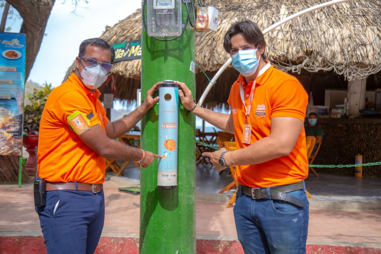 La activación de esta estrategia se llevó a cabo en la bahía de Taganga, donde fueron instalados 13 puntos de acopio y recolección de colillas de cigarrillos denominados ‘recipostes’. La entrega de estos contenedores, fabricados 100% con materiales reciclables, se hizo en conjunto con jornadas de sensibilización a la comunidad y turistas sobre el uso y preservación de los mismos.