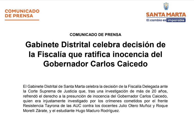 El Gabinete Distrital de Santa Marta celebra la decisión de la Fiscalía Delegada ante la Corte Suprema de Justicia que, tras una investigación de más de 20 años, refrendó el derecho a la presunción de inocencia del Gobernador Carlos Caicedo, quien era injustamente investigado por los crímenes cometidos por el frente Resistencia Tayrona de las AUC contra los docentes Julio Otero Muñoz y Roque Morelli Zárate, y el estudiante Hugo Maduro Rodríguez.