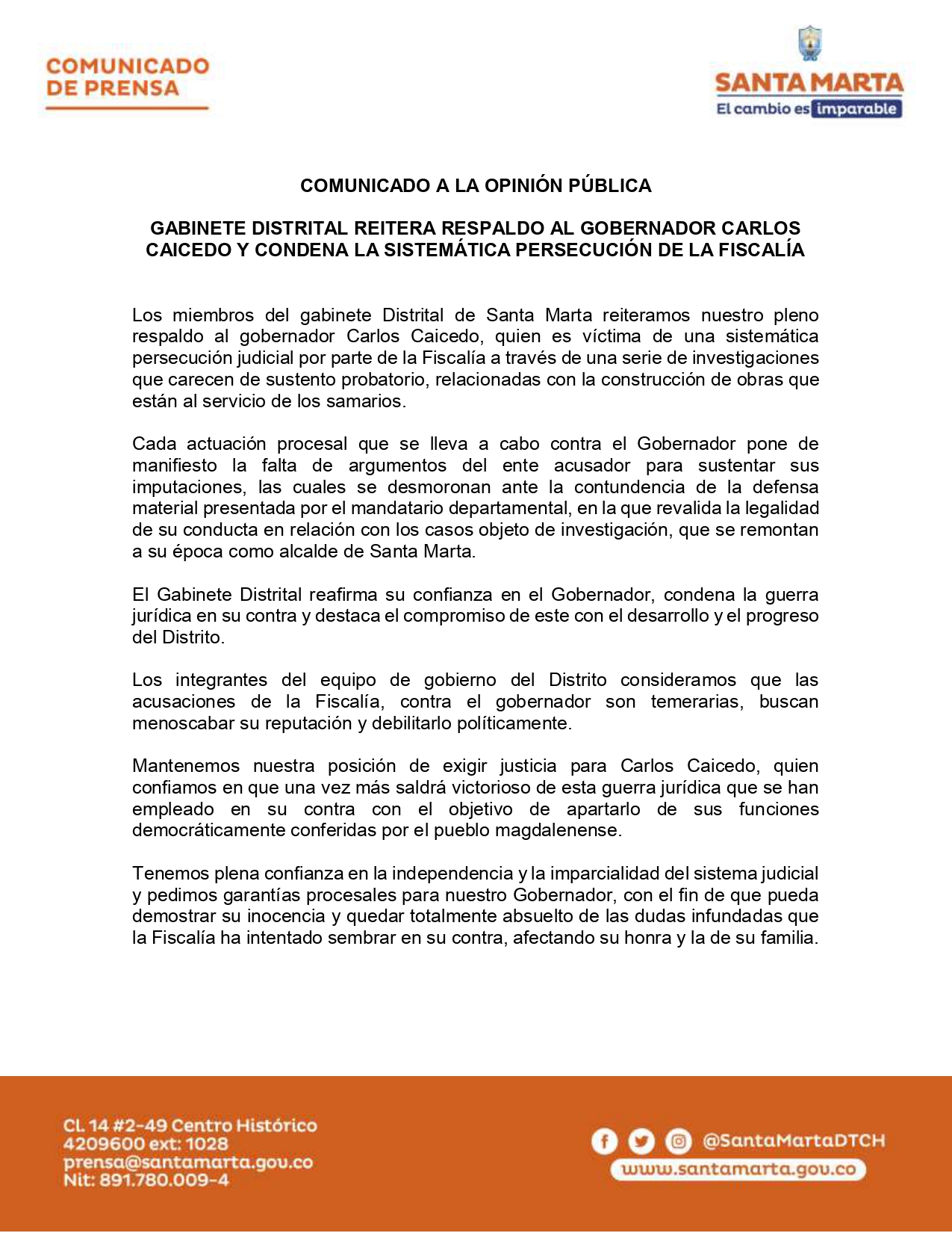 Los miembros del gabinete Distrital de Santa Marta reiteramos nuestro pleno respaldo al gobernador Carlos Caicedo, quien es víctima de una sistemática persecución judicial por parte de la Fiscalía a través de una serie de investigaciones que carecen de sustento probatorio, relacionadas con la construcción de obras que están al servicio de los samarios.