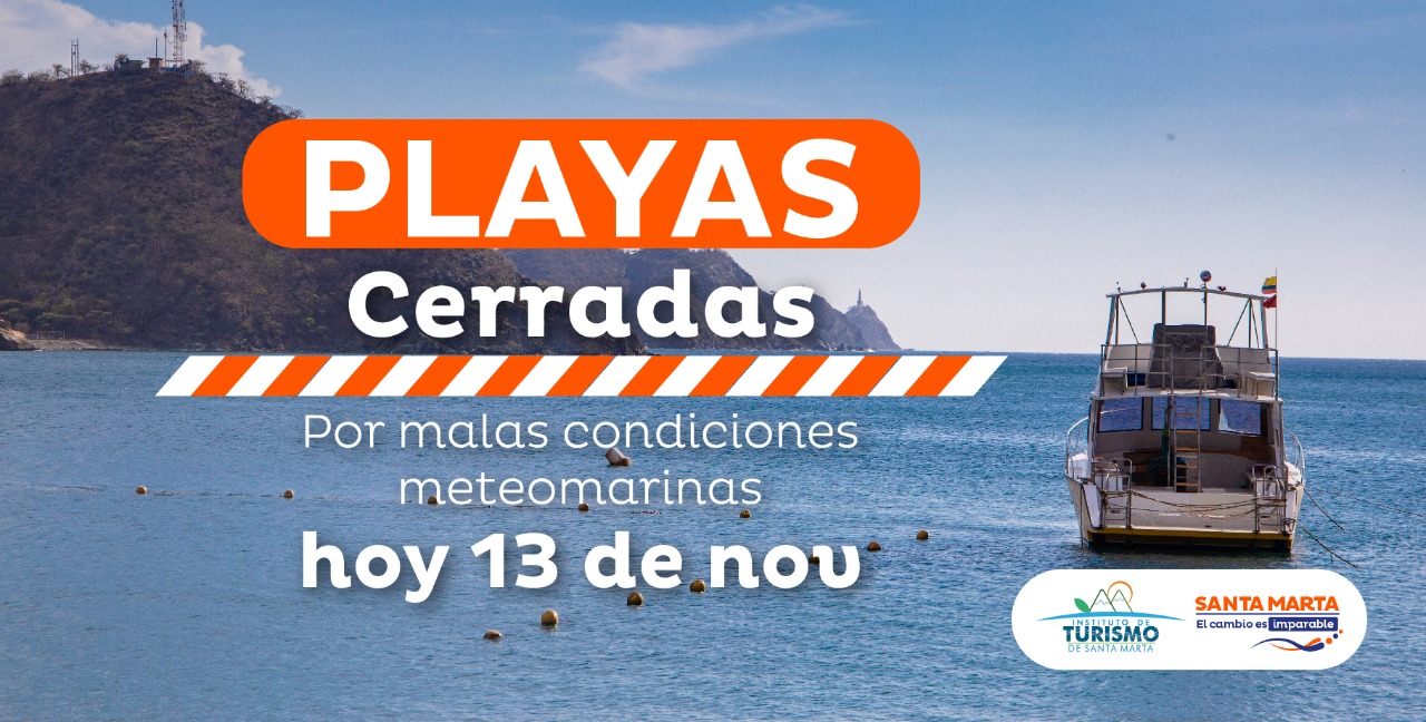 La Alcaldía Distrital de Santa Marta, a través de Instituto Distrital de Turismo- INDETUR, informa a la ciudadanía samaria y turistas visitantes que hoy viernes 13 de noviembre se realiza el cierre temporal de playas del Distrito, debido a las condiciones meteo marinas reportadas por Dimar, el concepto emitido por Gestión de Riesgo y los reportes de los Guardianes del Turismo presentes en cada sector turístico de la ciudad.