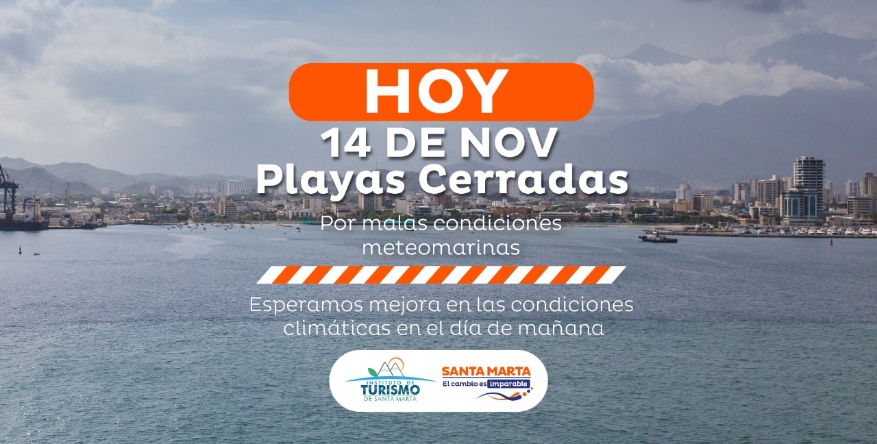 La Alcaldía Distrital de Santa Marta, a través de Instituto Distrital de Turismo- INDETUR, informa a la ciudadanía samaria y a los turistas que hoy sábado 14 de noviembre se cerrarán todas las playas del Distrito, debido a las condiciones meteo marinas reportadas por Dimar.